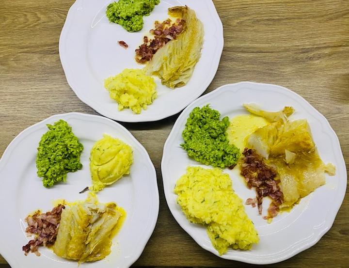 | Podanie z dodatkami | Na talerzu z puree z groszku i chrupiącym boczkiem. |